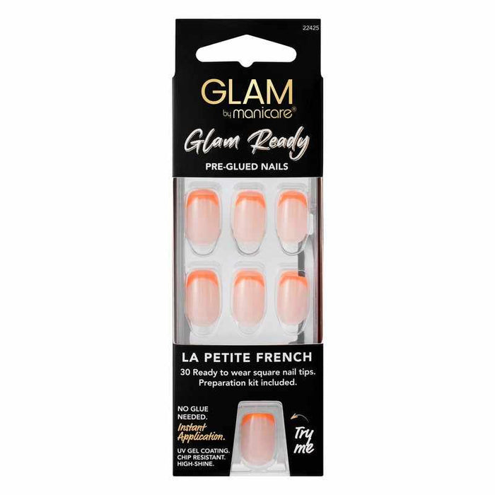 30 Ready to wear square nail tips. Preparation kit included. Glam By Manicare Glam Ready pre-glued nails can be worn instantly without the need to apply nail adhesive. Crafted with lightweight flexible material with a strong adhesive for comfortable wear and effortless application in seconds. Simply peel off the backing sheet, press in place and go!